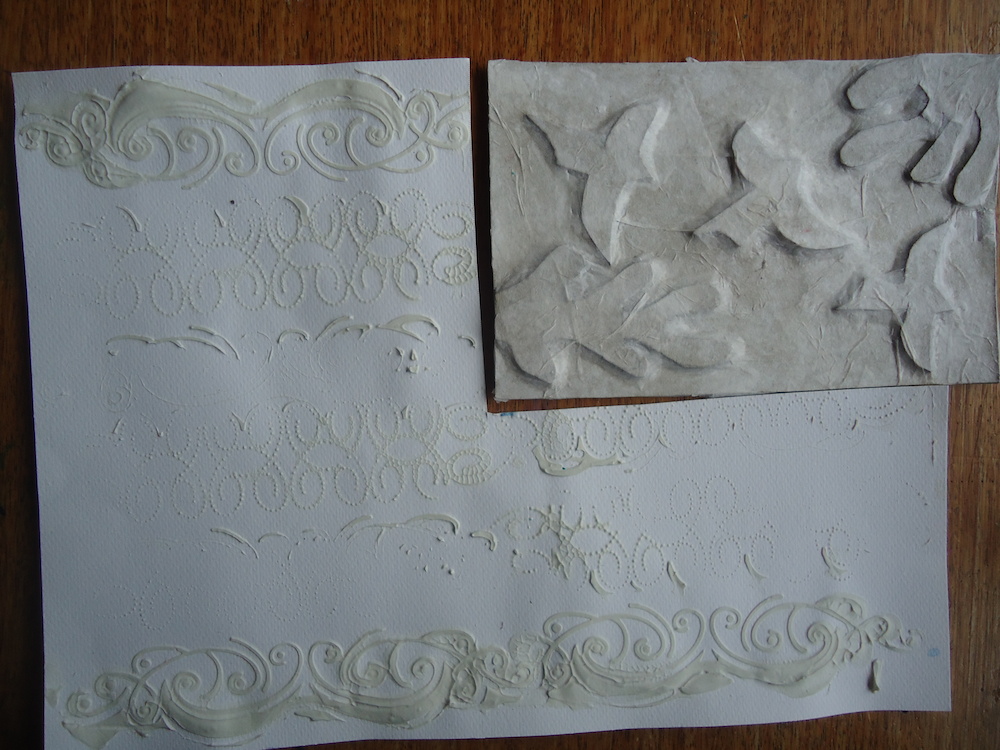 Het mooiste resultaat kregen we met moddeling paste die we met een sjabloon aan brachten op Lutradur en vervolgens de Lutradur wegbranden met de heatgun.