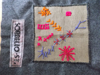 Hennie heeft de gevilte vogeltjes van de vorige keer afgemaakt en op de pagina een boom gemaakt waar ze in kunnen zitten. En ik heb de pagina er onder gemaakt, van allerlei stofjes verschillende maten rondjes geknipt en die op elkaar genaaid tot een bloem links en rechts van allerlei restlapjes vakjes gemaakt waar iets in kan. De vakjes zijn nog niet allemaal gevuld, maar dat komt nog wel. En ernaast een reep stof genaaid met aan weerszijden een mooi draadje en een rij knopen er op. Heel simpel allemaal. Nadat Hennie naar huis was heb ik nog een paar oude experimenten op een lap genaaid. Links een lap synthetisch vilt met een laag Gesso erover die bewerkt is met een soldeerbout en geborduurd is. En rechts strookjes karton waaromheen krant is geplakt en die op een lapje stof waren genaaid met een rij kraaltjes ertussen.
